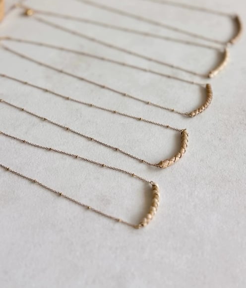 やさしいカーブのラウハラが、波のように首もとへ自然になじむネックレスです。